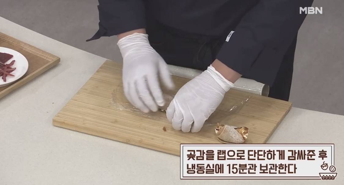 냉동실에 15분간 보관한다.6. 냉장고에서 꺼내온 곶감을