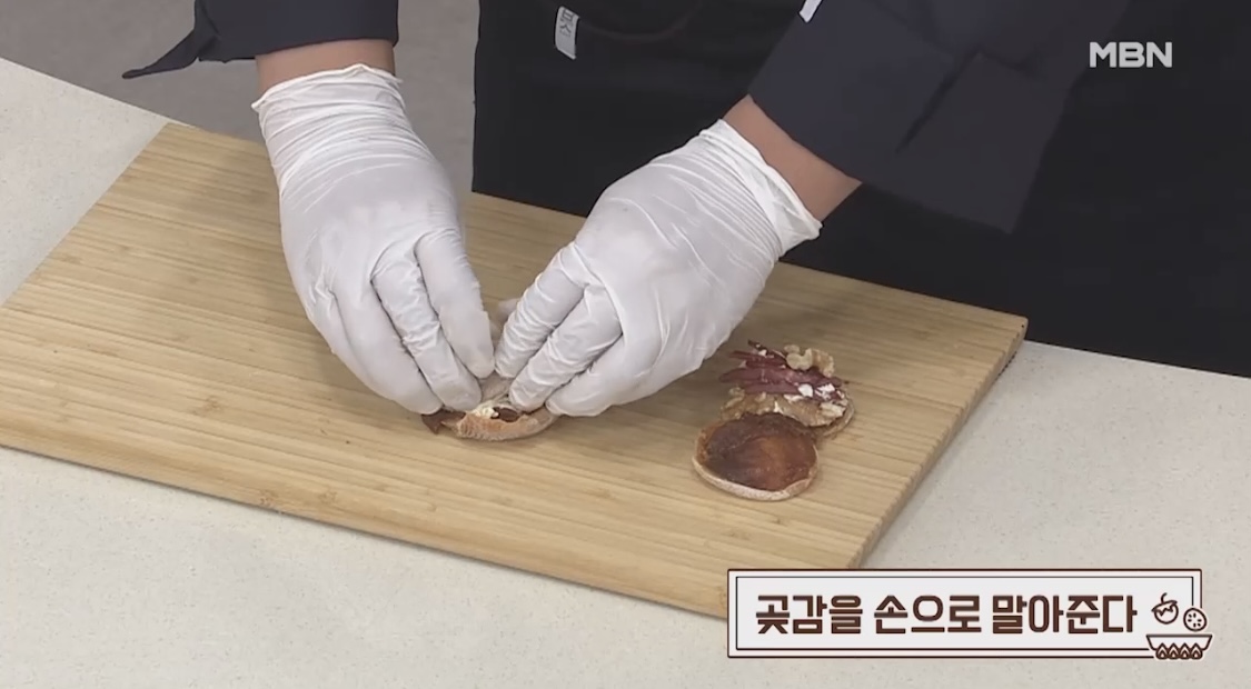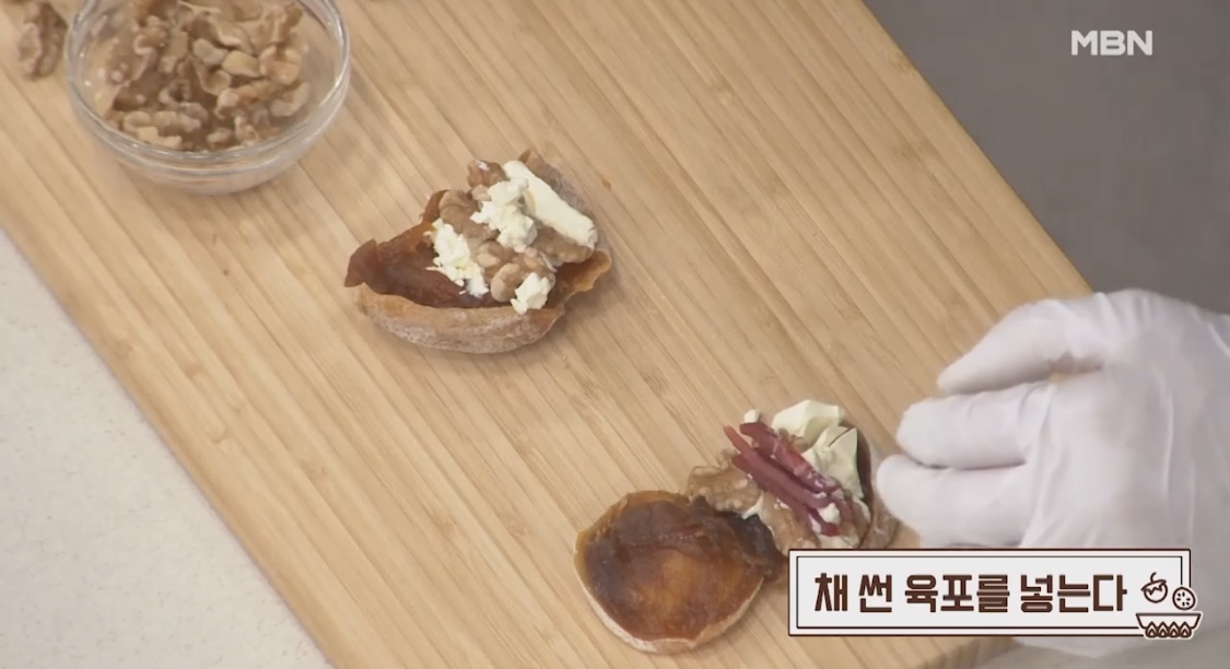 호두위에 다시 크림치즈를 넉넉히 덮는다.4. 채 썬 육포를 넣고 곶감을 손으로 말아준다.