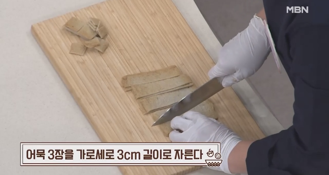 1. 어묵 3장을 가로세로 3cm 길이로 자른다.