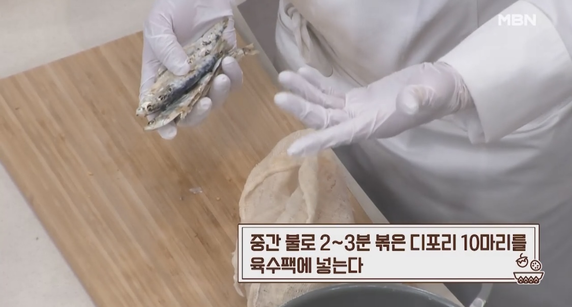 10마리를 육수팩에 넣는다.17. 육수팩을 냄비에 넣어 끓인다.