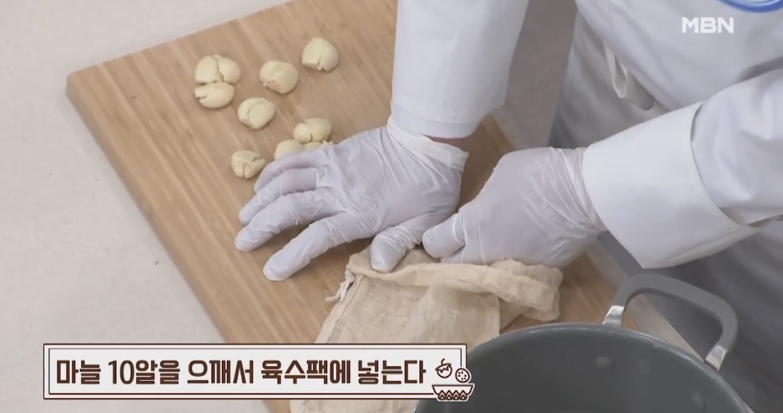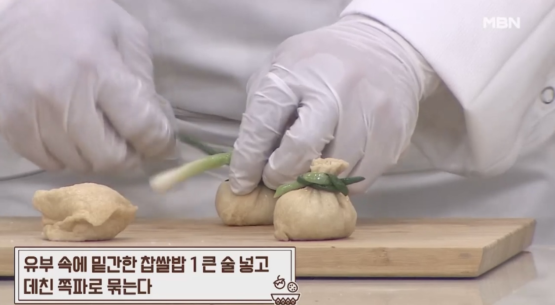 1큰술을 넎고 데친 쪽파로 묶는다.22. 10분 끓인 육수의 불을 약불로 줄이고