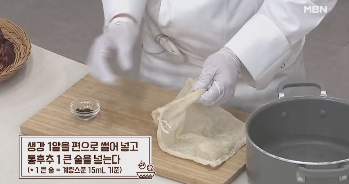 육수팩에 넣는다.12. 생강 1알을 편으로 썰어 넣고