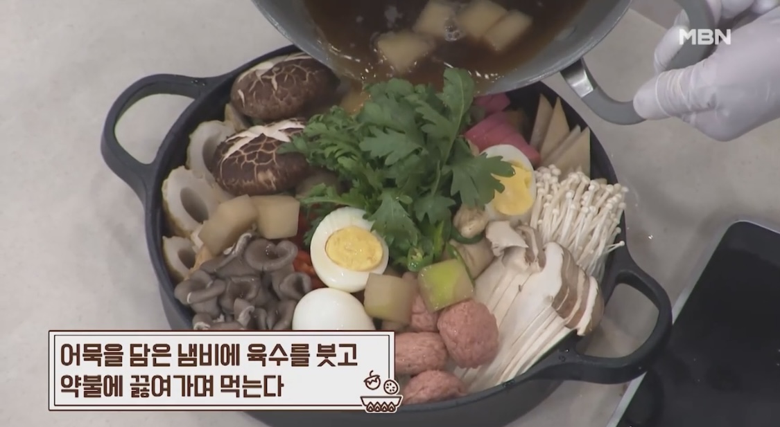 어묵, 버섯, 쑥갓, 대파, 달걀을 채워준다.26. 어묵을 담은 냄비에 육수를 붓고