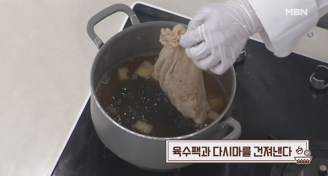 다시마 2장을 넣어 5분 더 끓인다.23. 육수팩과 다시마를 건져낸다.