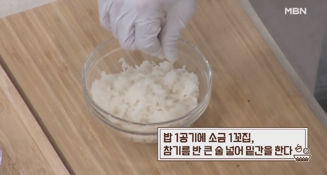 참기름 반 큰술을 넣어 밑간 한다.21. 유부 속에 밑간한 찹쌀밥