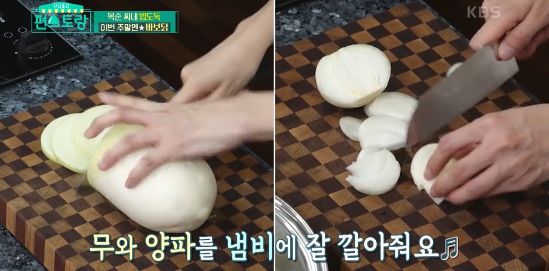 찬물에 헹궈 채반에 받쳐 놓는다.2. 무 1/4 개와 양파 1개는 1cm 두께,