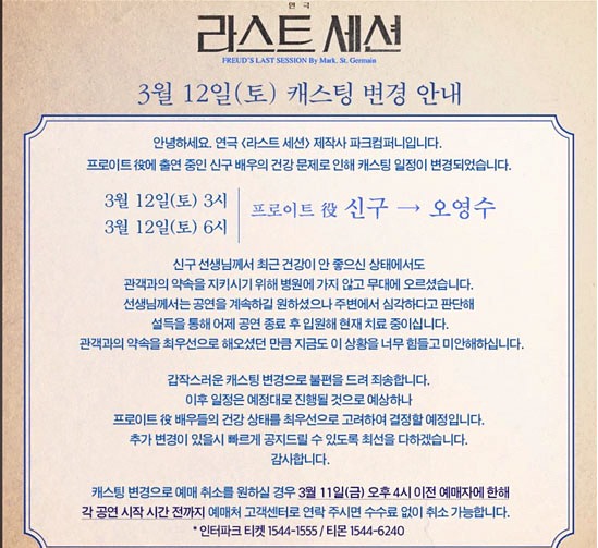 배우 신구가 건강 문제로 공연에 불참합니다.