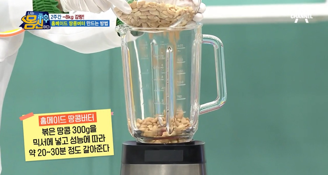1. 볶은 땅콩 300g을 믹서에 넣고