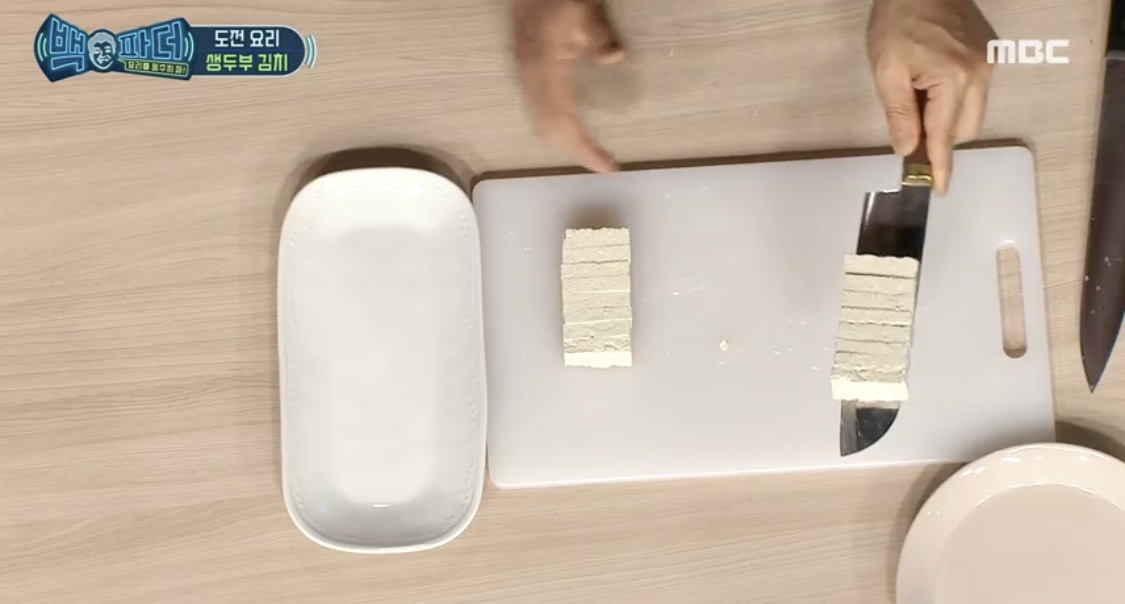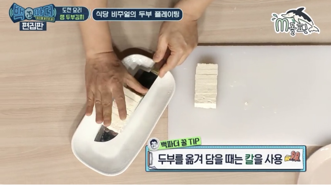 칼날 위에 두부를 올려 접시로 옮겨줍니다.