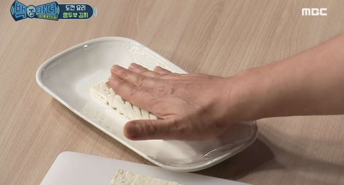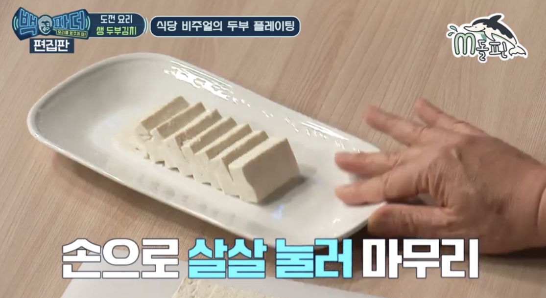두부를 한 손으로 살포시 잡고 반을 자르고