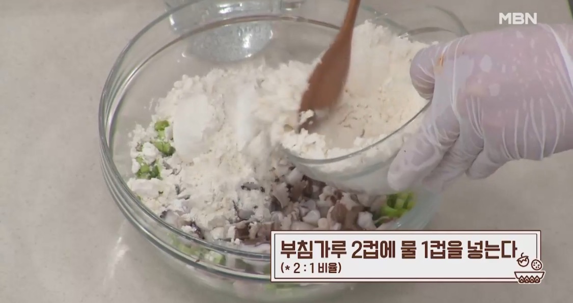 7. 부침가루 2컵에 물 1컵을 넣는다.