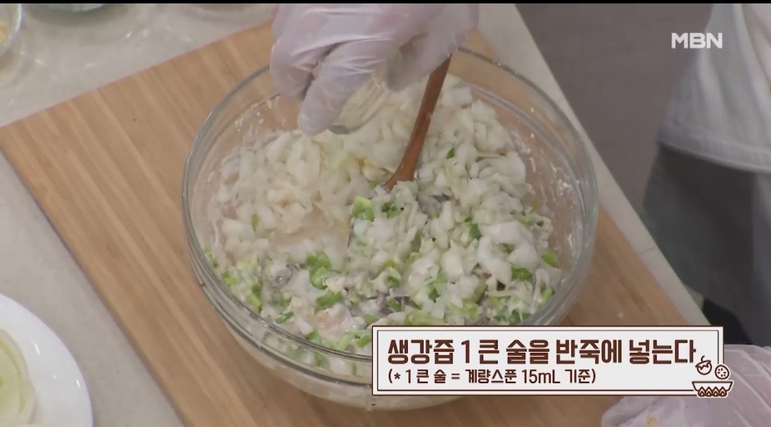 생강즙 1큰술을 반죽에 넣고 섞는다.9. 다진마늘 1큰술, 홍고추 두개,
