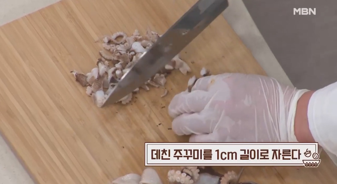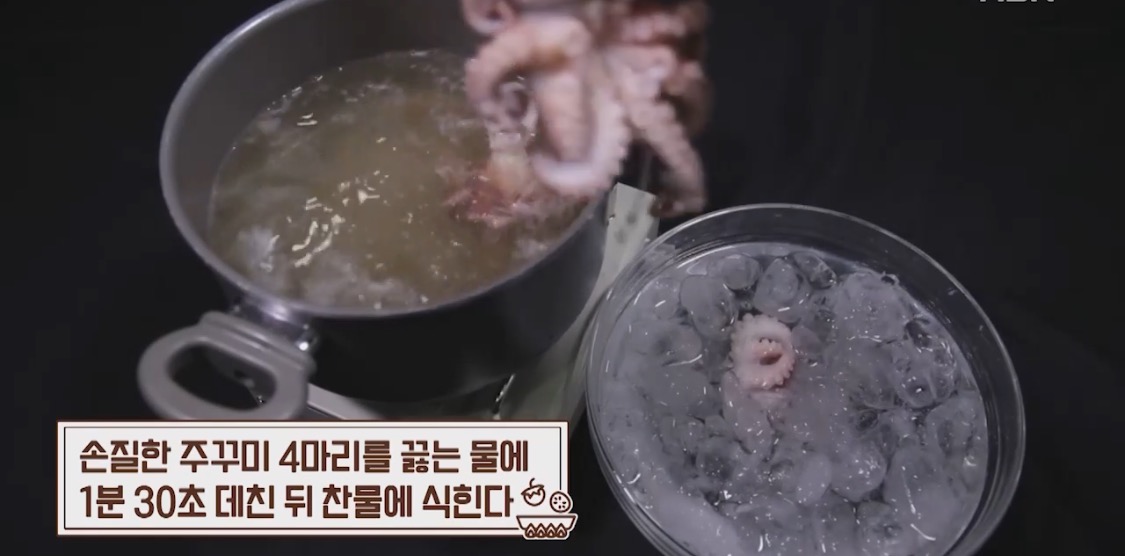 1분 30초 데친 뒤 찬물에 식힌다.2. 데친 주꾸미를 1cm 길이로 자른다.