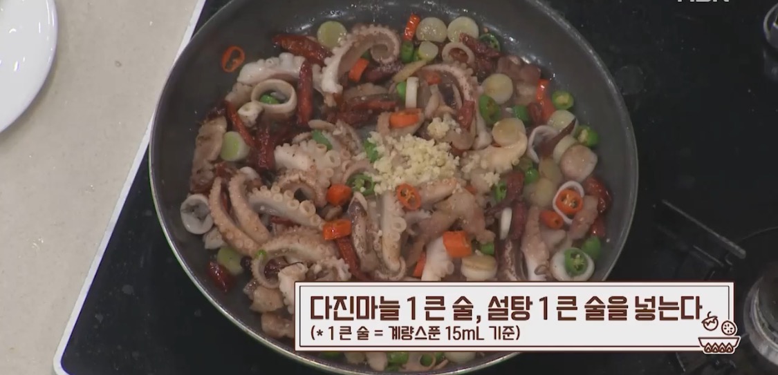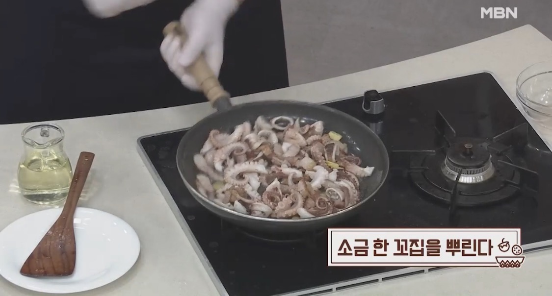 식용유를 넣는다.4. 데친 주꾸미는 먹기좋은 사이즈로 자르고