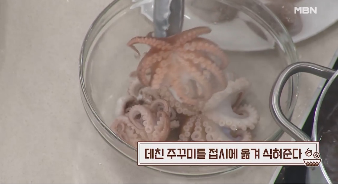 * 핑크빛이 돌면 건져내세요 !2. 데친 주꾸미를 접시에 옮겨 식혀준다.