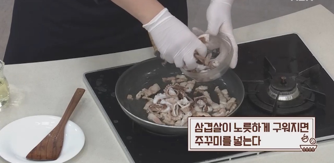 5. 삽겹살이 노릇하게 구워지면 주꾸미를 넣고