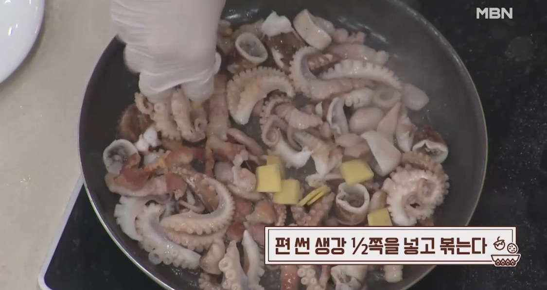 편 썬 생강 1/2 쪽을 넣고 볶는다.6. 소금 한 꼬집을 뿌리고