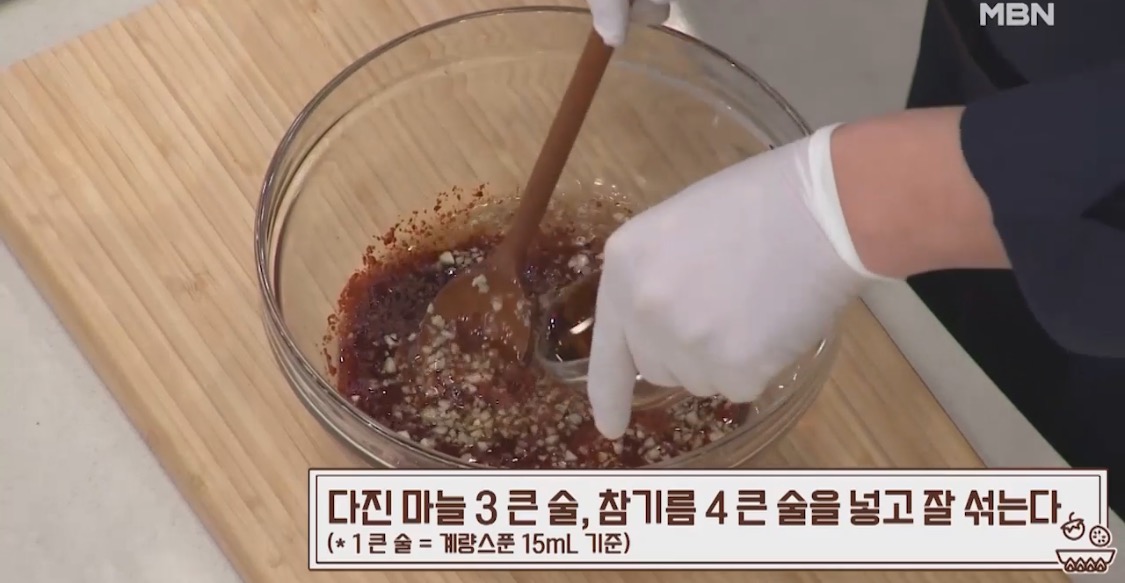 매실청 8큰술, 멸치액젓 3큰술을 넣는다.4. 다진마늘 3큰술, 참기름 4큰술을 잘 섞어