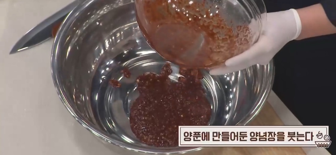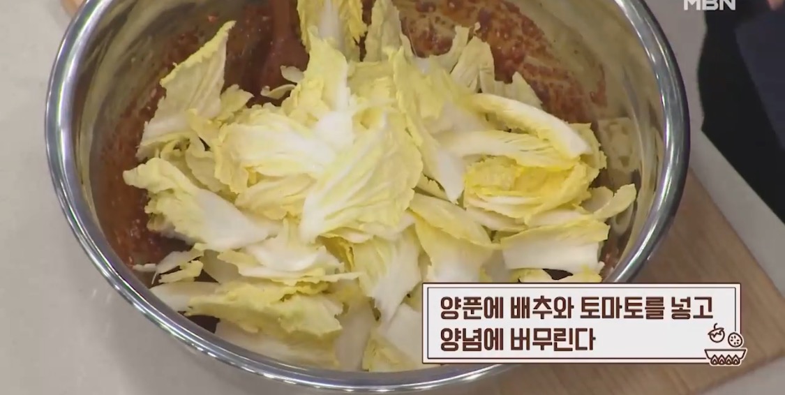 양푼에 양념장을 붓는다.5. 양푼에 배추와 토마토를 넣어 버무리고