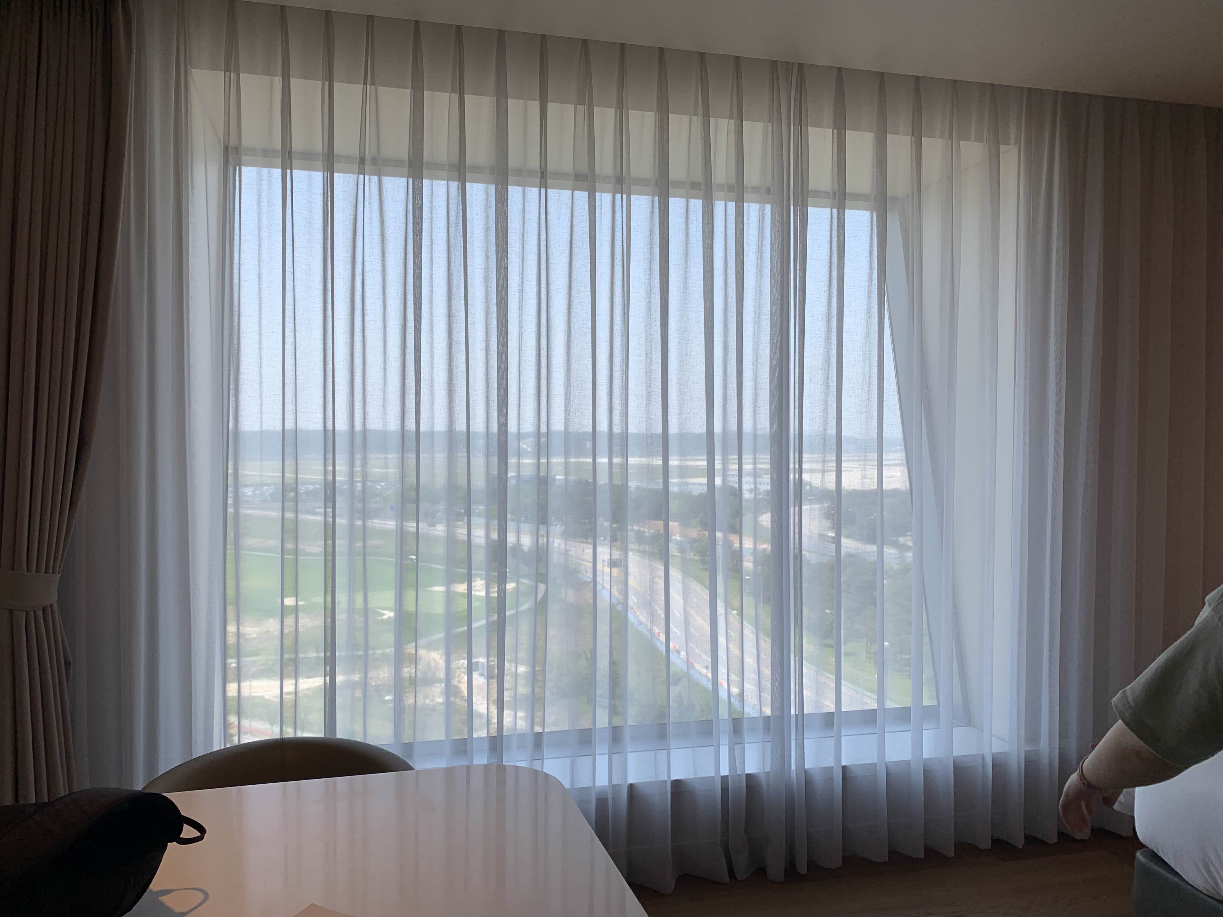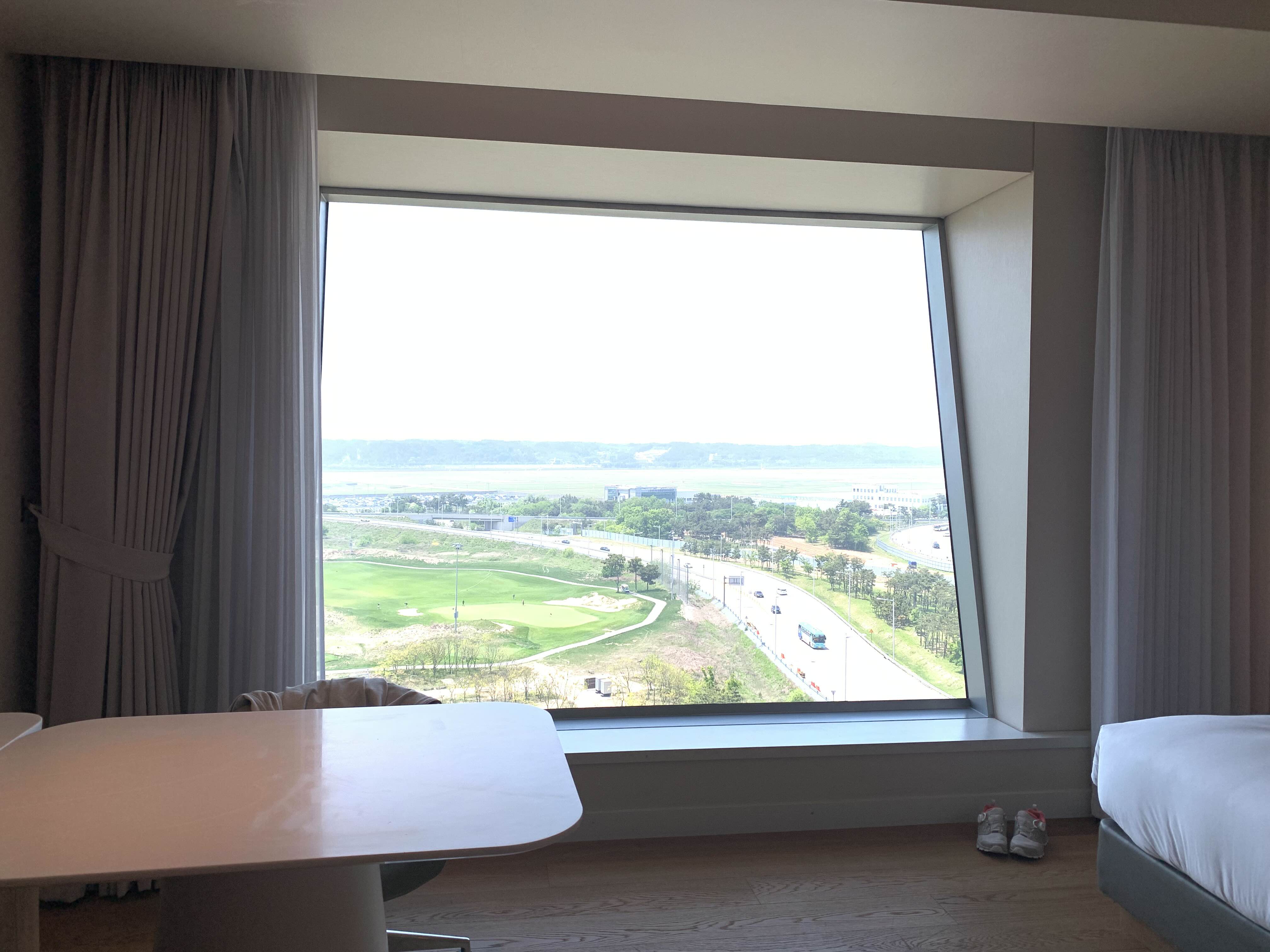 커튼을 열면 큰 통창으로 골프장이 보여요.
