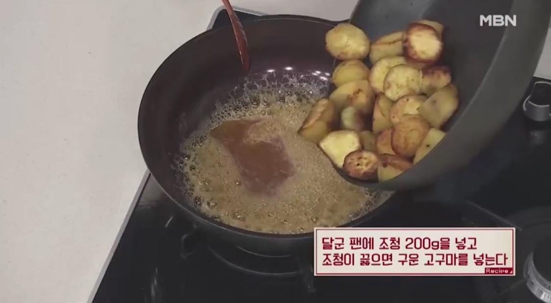 겉면이 노릇해질 때까지 굽는다.4. 달군 팬에 조청을 넣고 끓여 고구마를 넣는다.