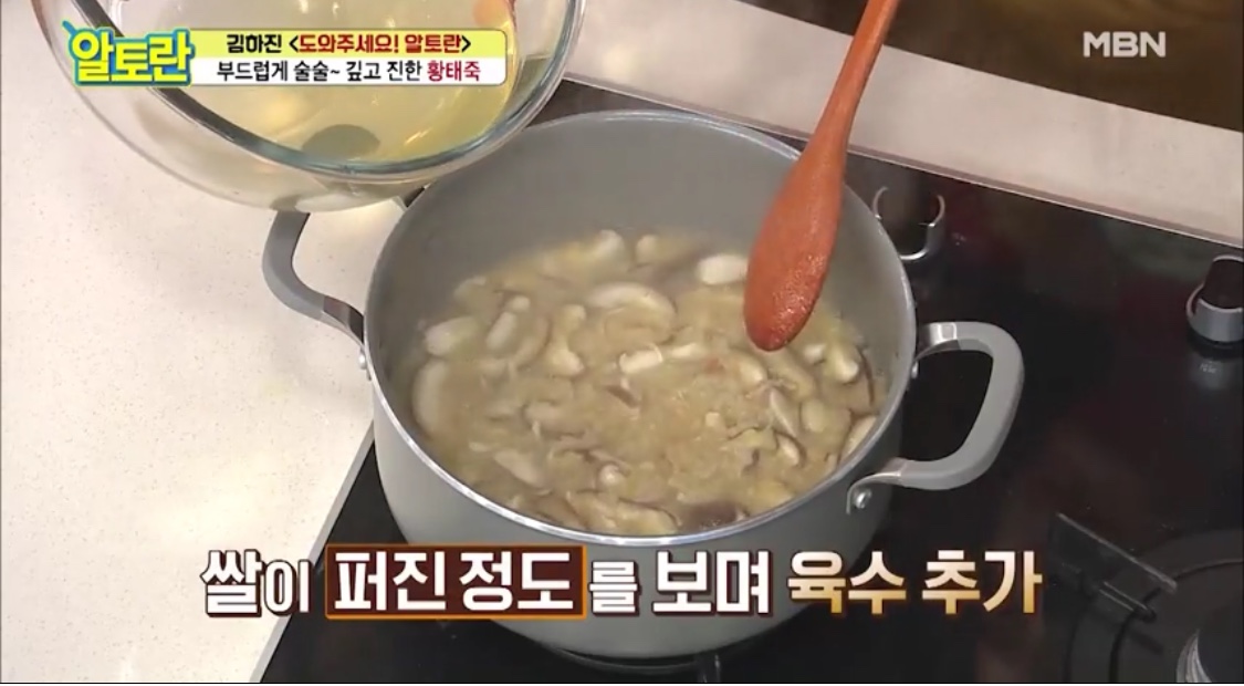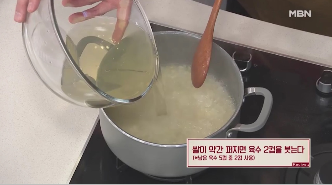 쌀이 퍼진 정도를 보며 육수를 추가해요.