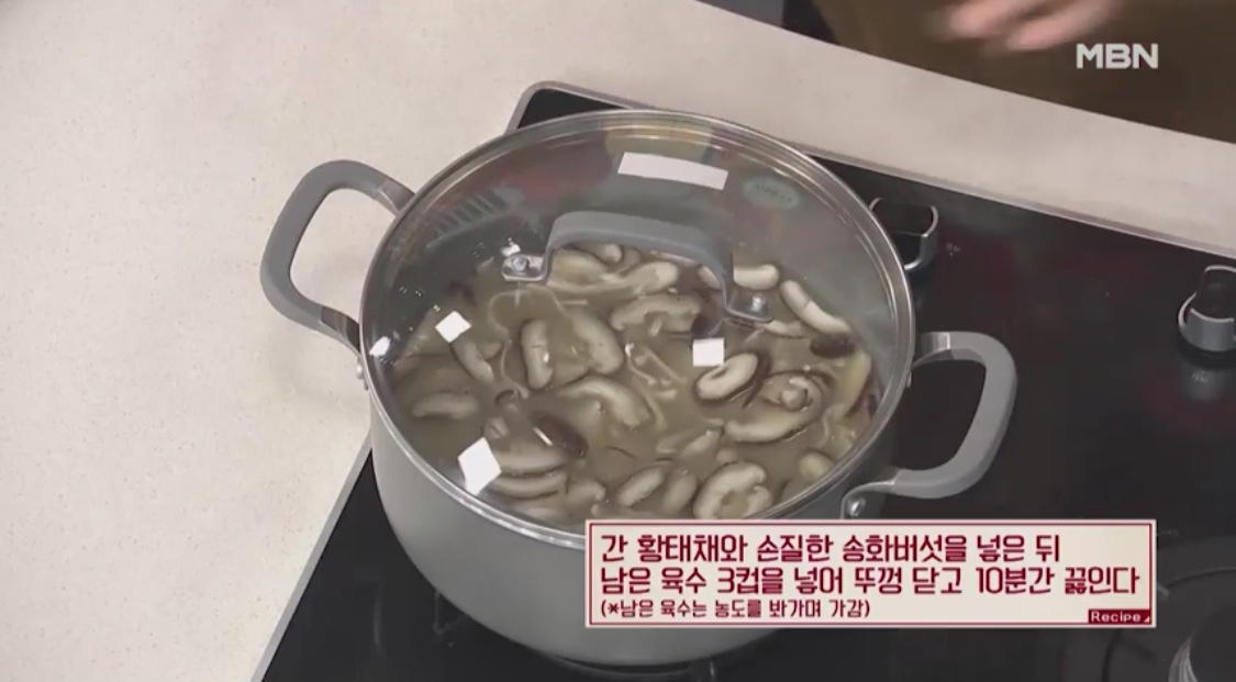 10. 간 황태채와 손질한 송화버섯을 넣은 뒤