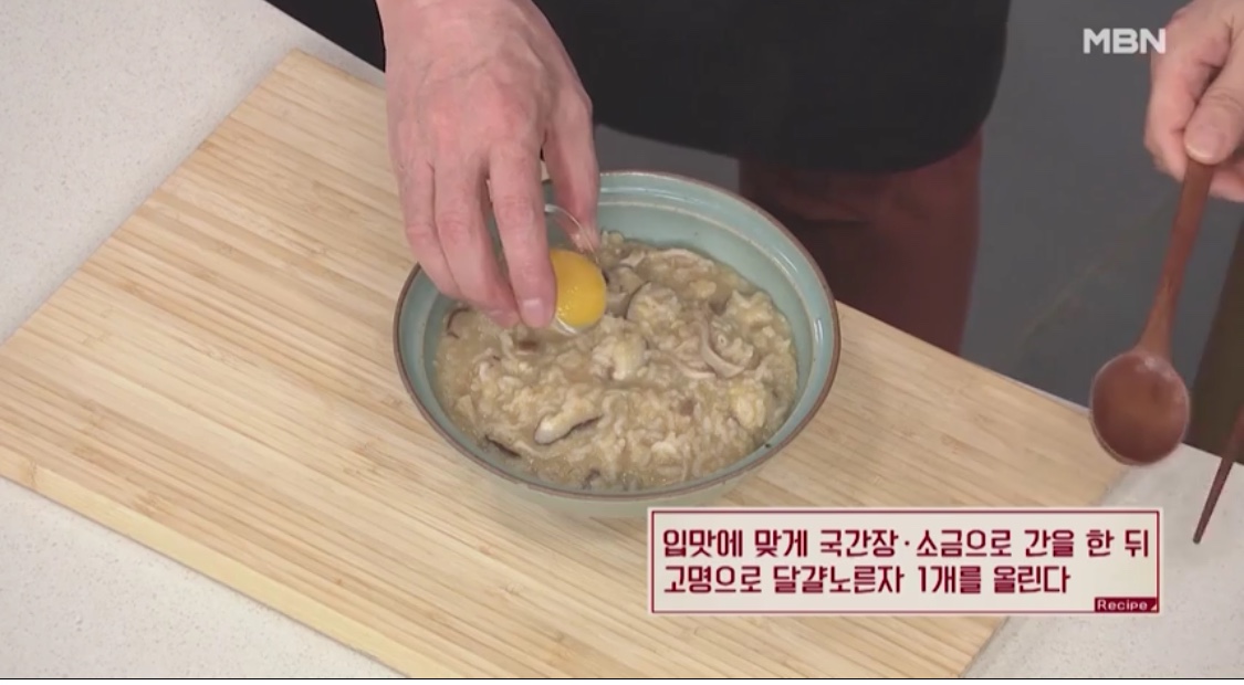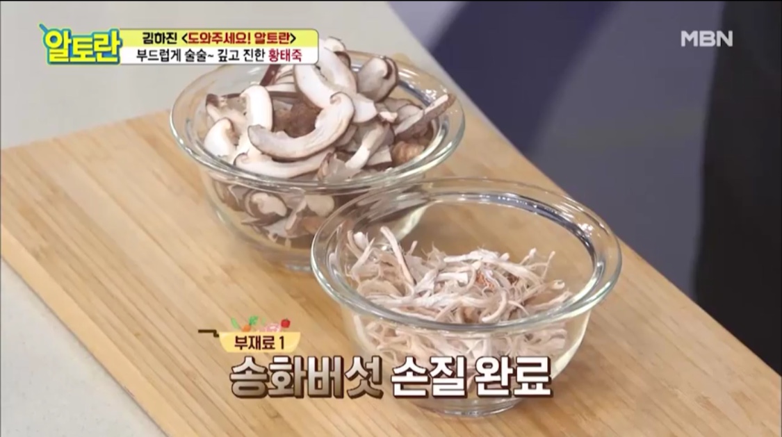 재료: 황태채, 송화버섯, 콩나물, 무, 통마늘, 저민생강, 청양고추, 불린 쌀, 불린 녹두, 참기름, 국간장, 소금, 깨소금, 실파, 김가루, 달걀노른자