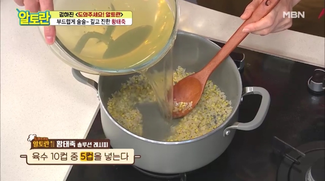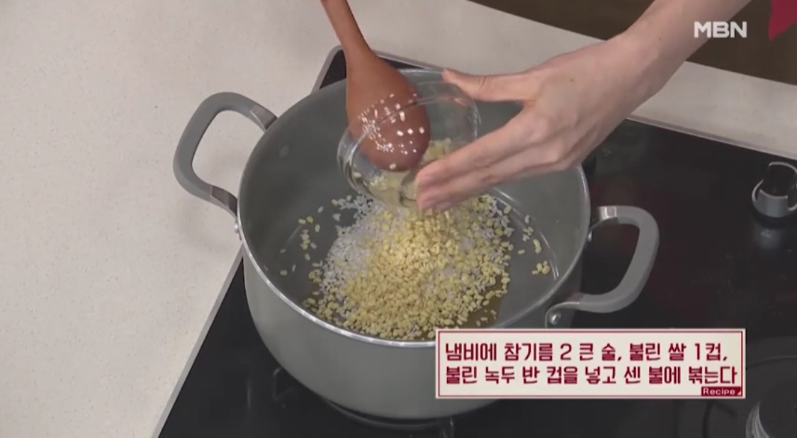 불린 녹두 1/2컵을 넣고 센 불에 볶는다.8. 육수 10컵 중 5컵을 넣고 뚜껑을 덮는다.