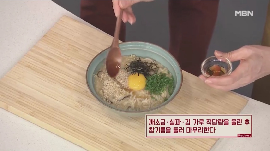 참기름을 둘러 마무리한다.보기만해도 고소함이 느껴지는 황태죽 완성!