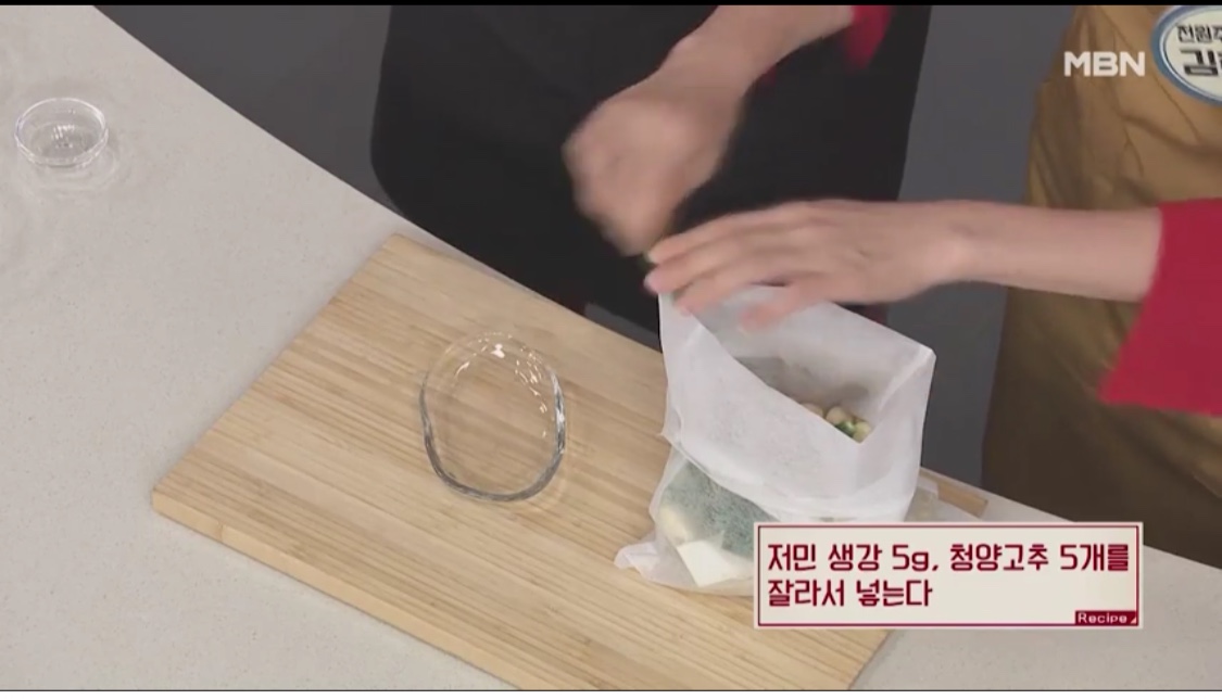 통마늘 50g을 넣는다.5. 저민 생강 5g, 청양고추 5개를 잘라넣는다.