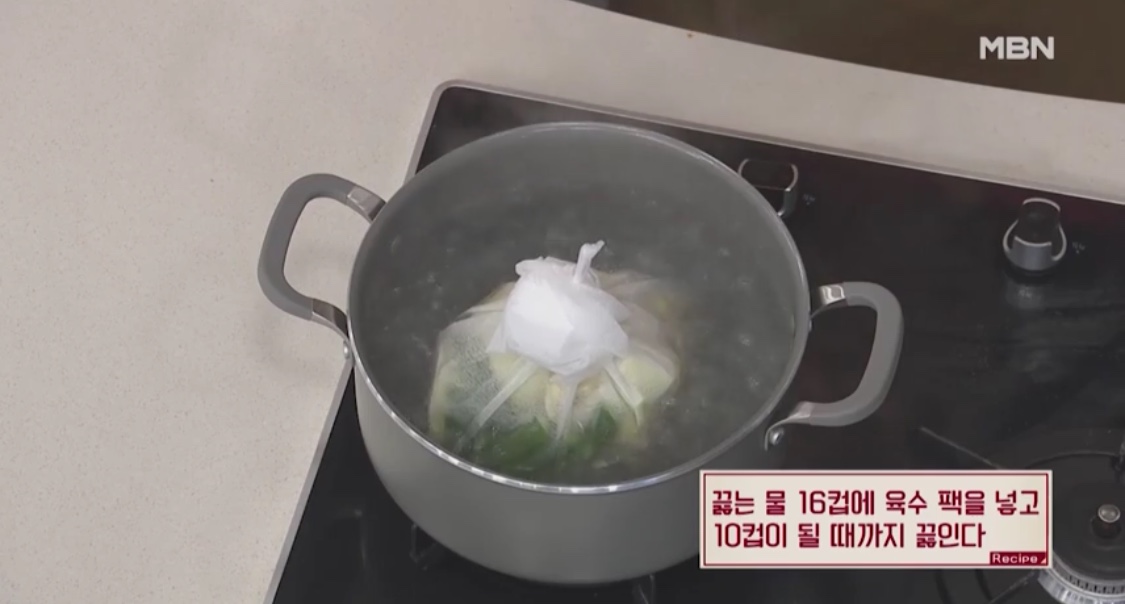 끓는 물 16컵에 육수 팩을 넣어요.
